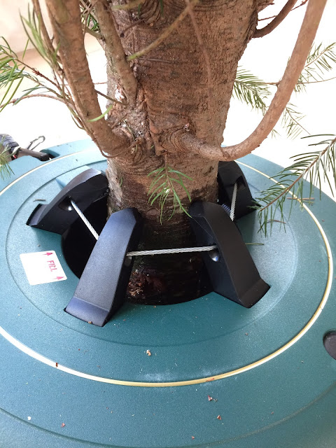 Here is how out 7-8 foot tree looks in the stand. Those plastic posts may not look like they are really holding the tree tightly, but it really is. You can see it digging into the tree and almost puncturing the trunk. The force at which you are pushing your foot down to tighten the metal wire for the posts to clamp down onto the free is quite strong and you will feel assured that your tree will stand securely without toppling over onto the floor.