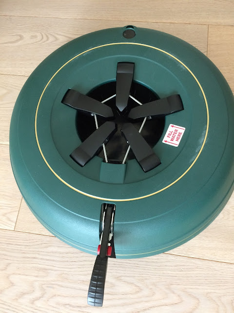 I am a total fan of German made products. Why? Because of the ingenious designs and quality given to each product they sell. I've not yet had a disappointing product and if I did, I'm fairly confident that I'd receive satisfactory resolution from their customer service. So when it comes to the holidays and shopping around for a tree stand, I thought why wouldn't I look into the best of the best for a tree stand? One that would make our lives easier when we are hauling that big fresh tree in the house and fighting to get it into the tree stand straight and secure for the entire holiday season. That's when I stumbled onto KRINNER's Christmas Tree Genie. Let's start off with unpacking this beast. Already, I was totally impressed with the thoughtfulness of the package design. You pull on the handle (as pictured) to slide out the insert that contains the heavy tree stand. It's the little things that make your life easier that you appreciate when you get such a thoughtful design. If I had to pull that heavy stand out, and boy is it heavy, I'd probably end up tearing the box trying to get it out. The tree stand is 18 lbs so it securely sits on the floor, even with a giant heavy tree in it!